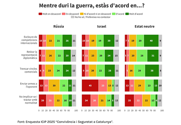 Quan la pregunta no identifica cap país concret, el suport a mesures de sanció creix. Un 67% dels enquestats es mostra favorable a trencar vincles comercials amb un estat agressor, un 60% defensa la seva exclusió de competicions esportives i un 57% retiraria la representació diplomàtica.