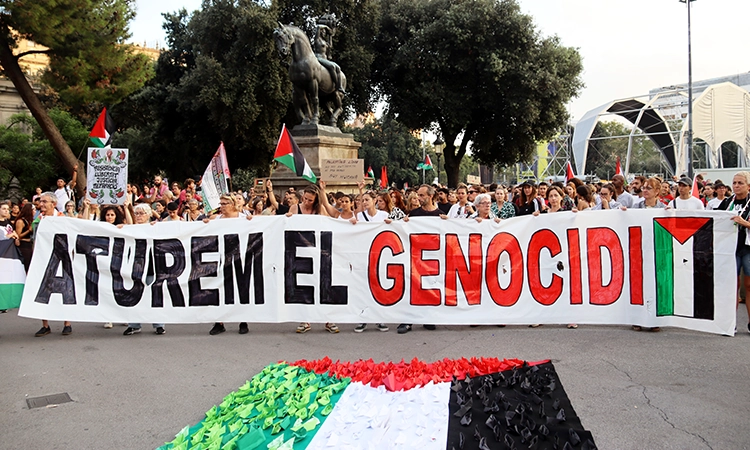Pancarta de la manifestació que demana aturar el genocidi a Gaza a Barcelona [Foto: Nazaret Romero / ACN]