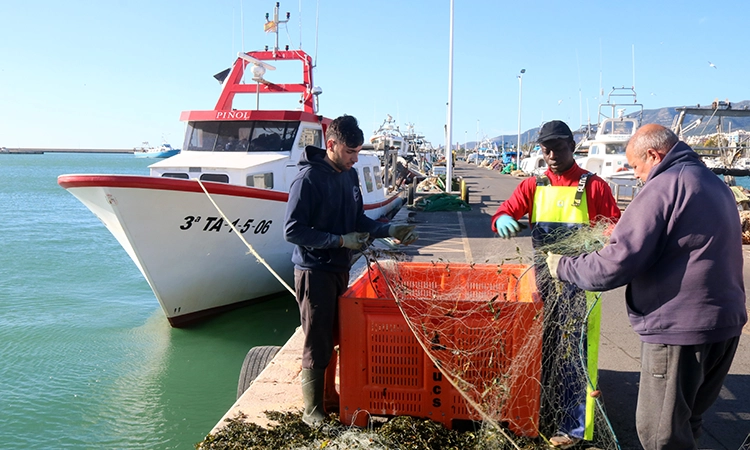 Pescadors treballant en el manteniment de les xarxes al port de la Ràpita [Foto: Jordi Marsal / ACN]