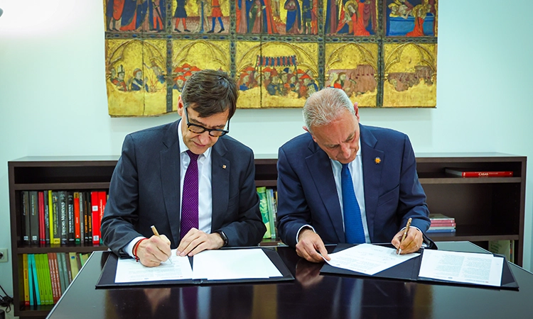 El president Illa i el secretari general de la Unió per la Mediterrània, Nasser Kamel, signant un conveni [Foto: Govern]